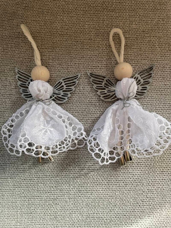 Ręcznie robiony anioł, główka drewno, skrzydła PLA pomalowane farbą akrylową metaliczną.